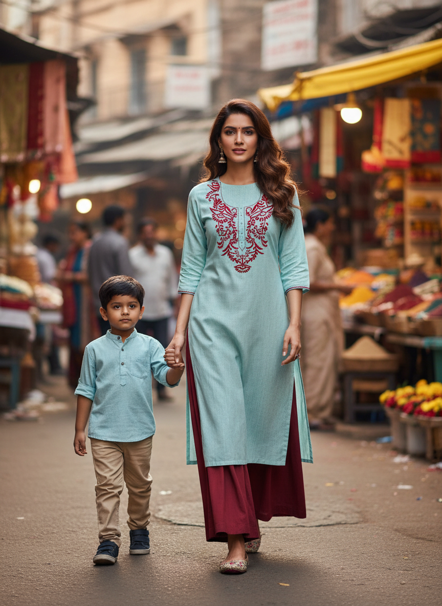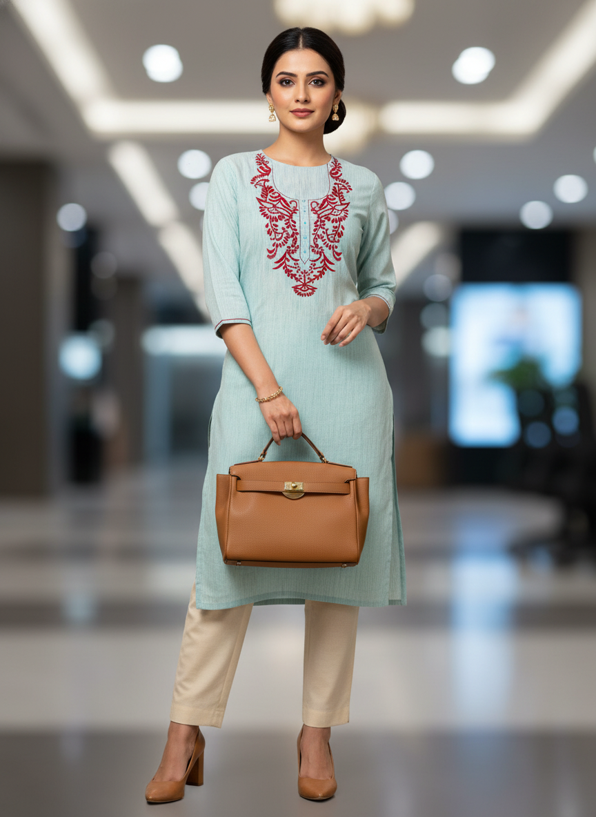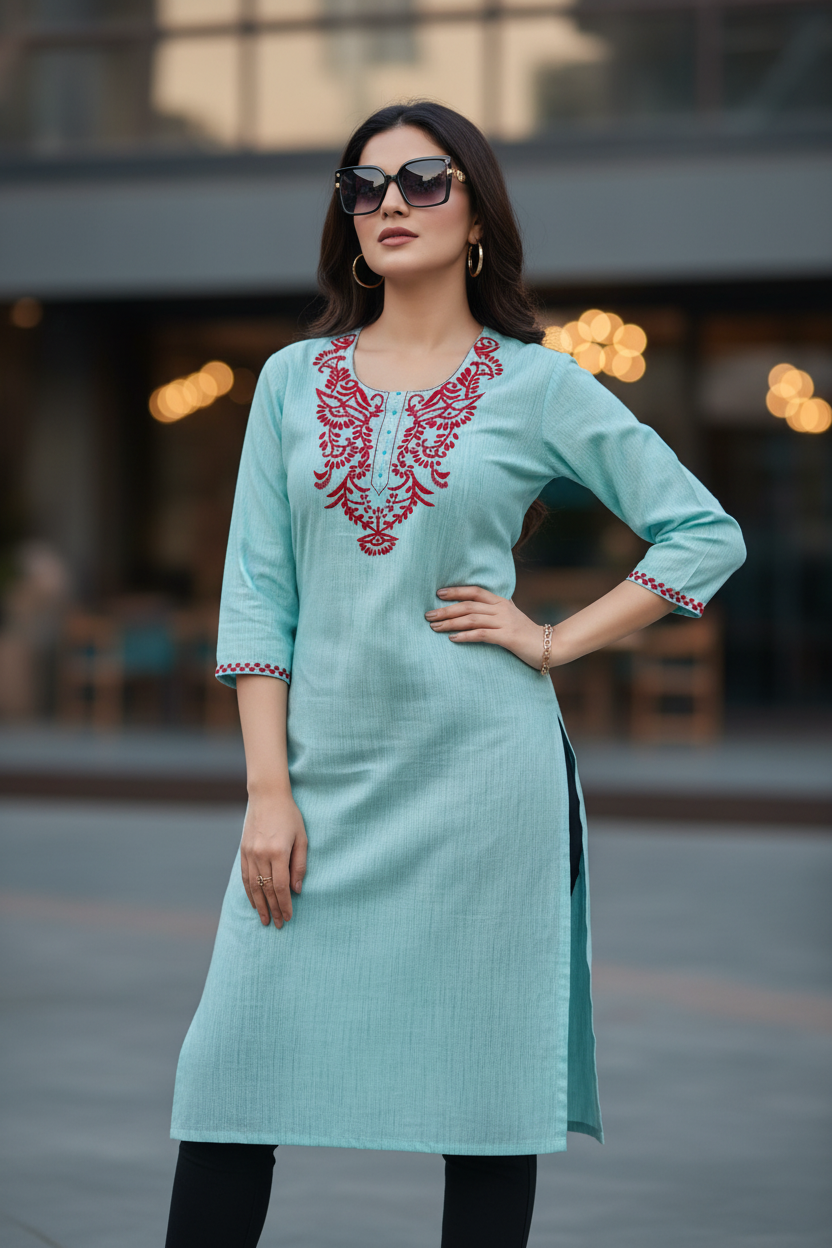 UNSTITCHED HAND -EMBROIDERD KURTEES (LIGHT BLUESTRIPED)