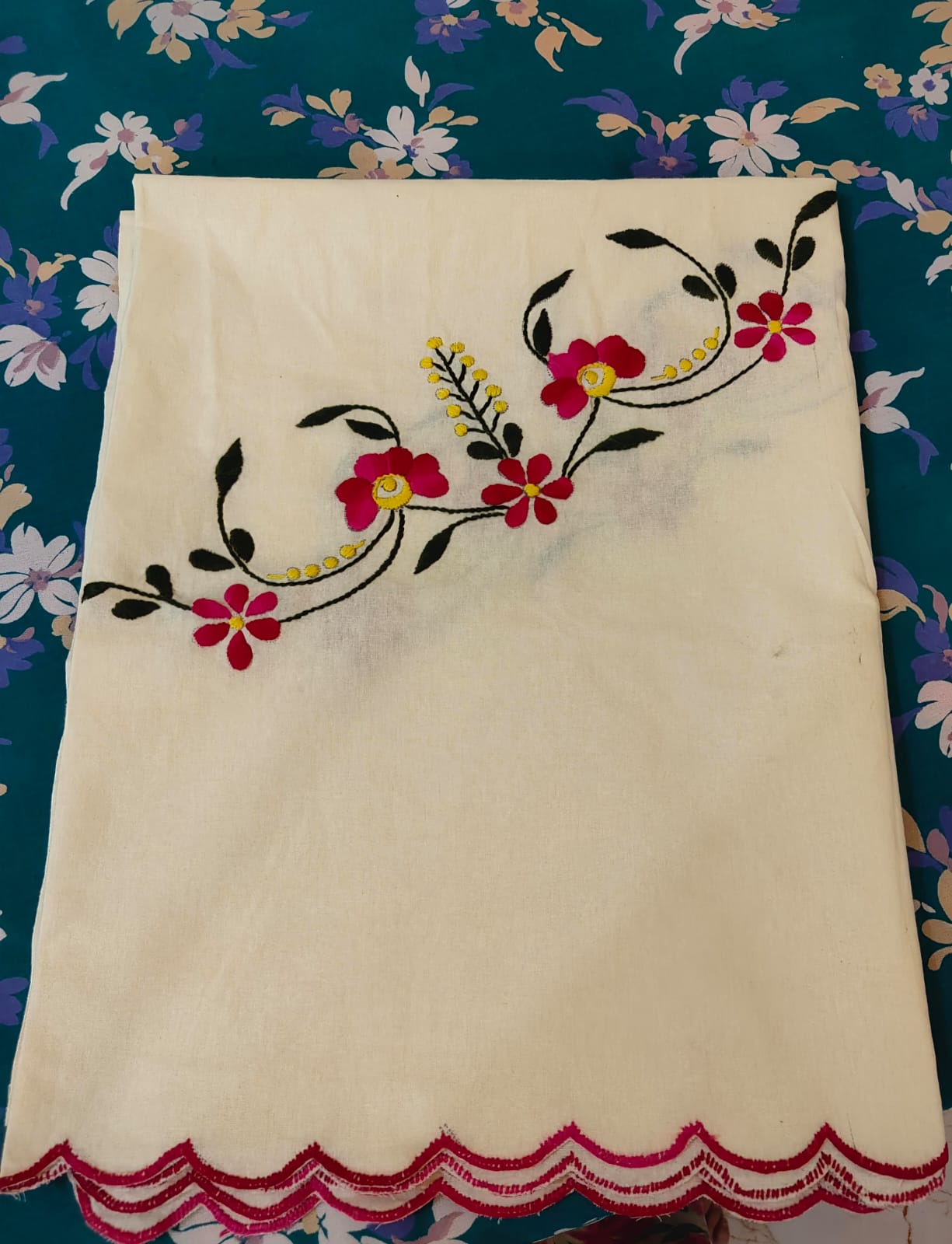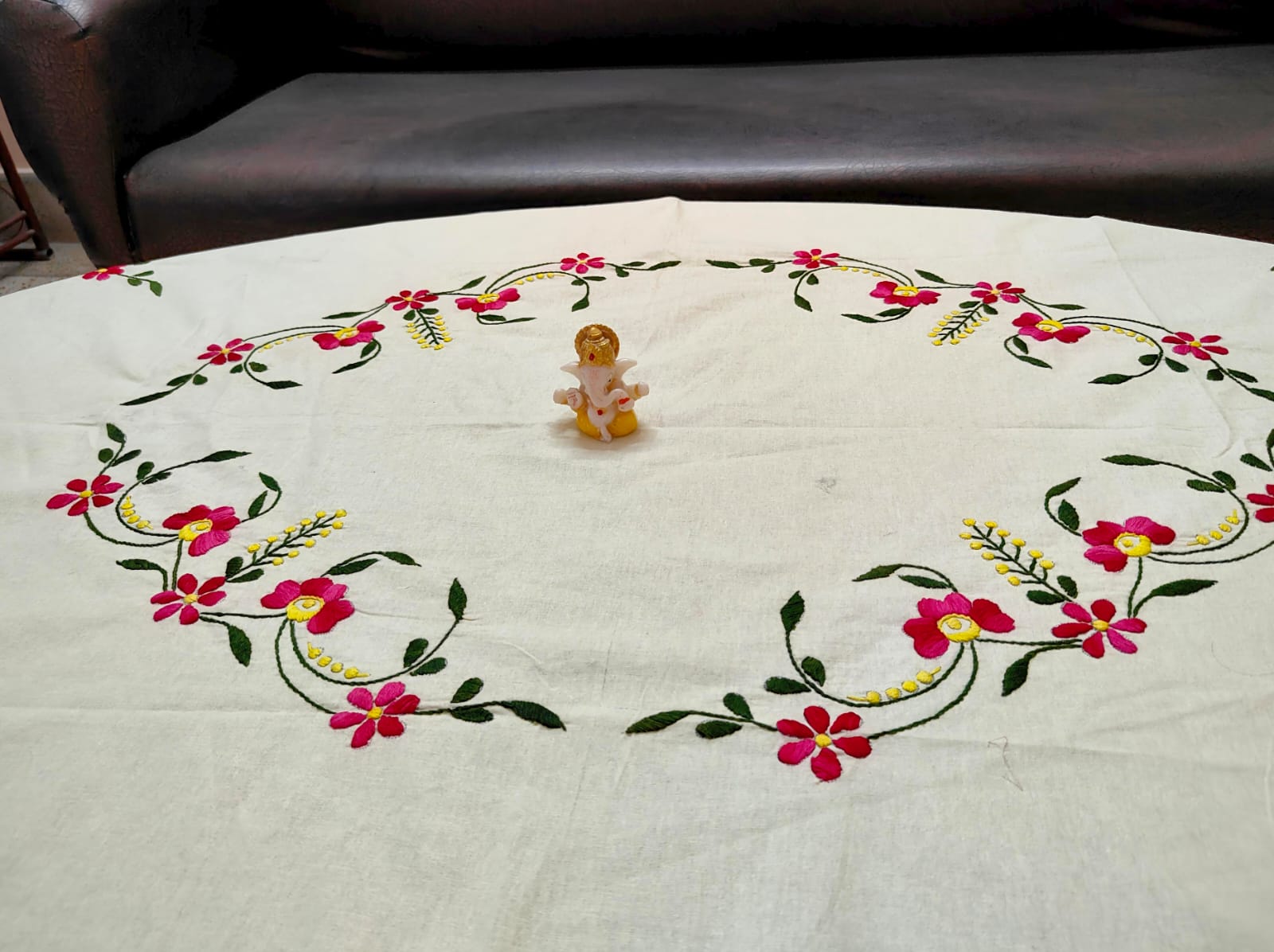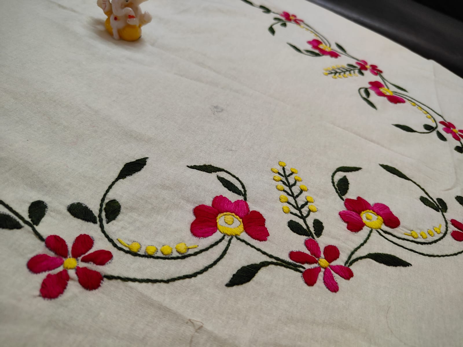 This luxurious table cover in pure cotton will elevate any tea time experience. The vibrant base yellow is accentuated by the intricate bright red and green embroidery, adding a touch of sophistication and style to your tablescape. Measuring at 52x33 inches, it's the perfect size for any center table.